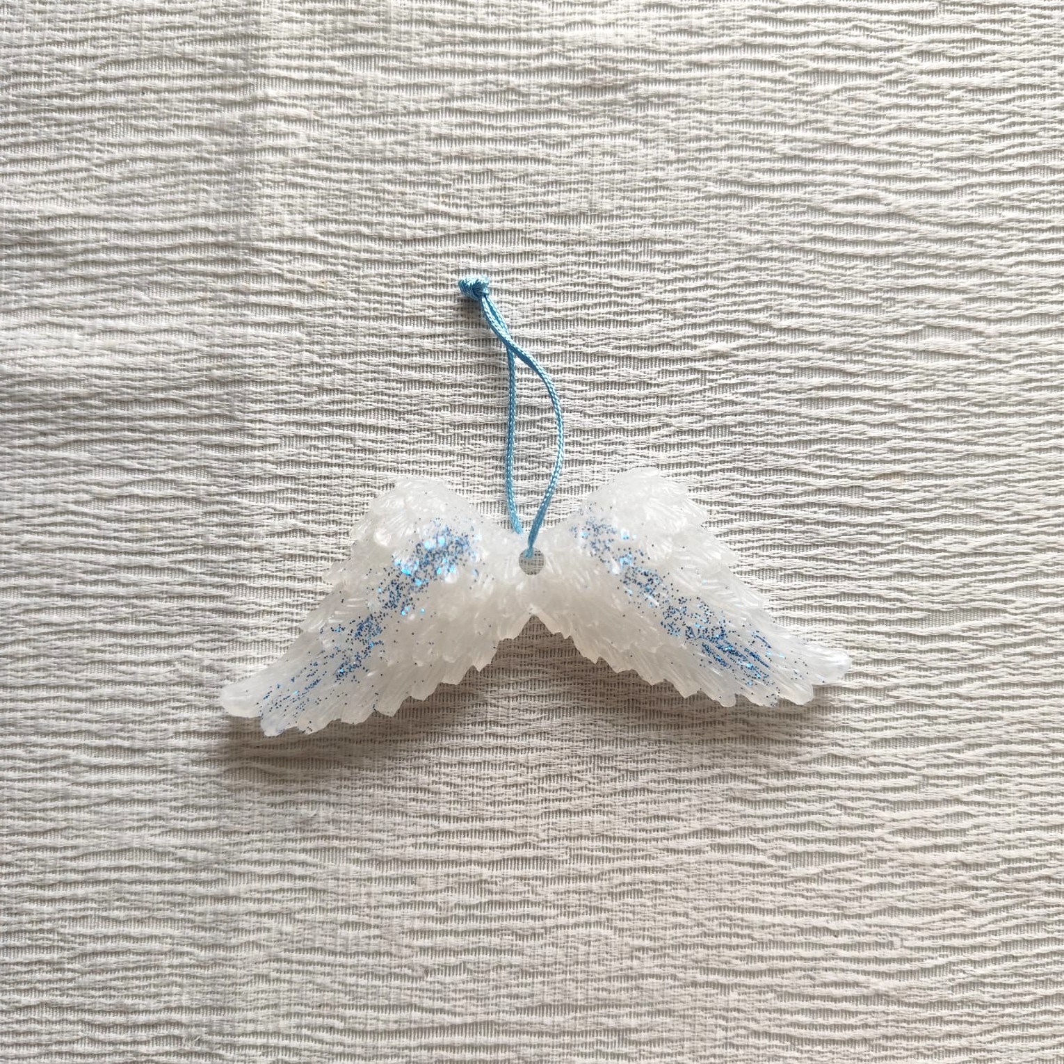 🔸 Matériau : résine époxy, Ailes d’anges à suspendre dans le sapin. Couleur blanc paillettes bleues.