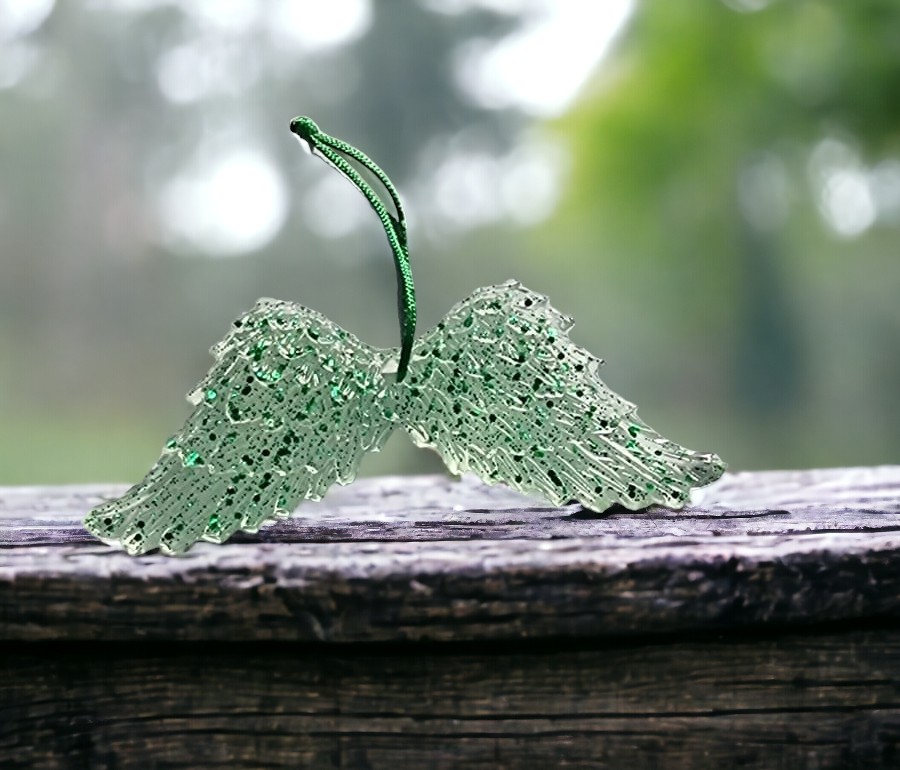🔸 Matériau : résine époxy, Ailes d’anges à suspendre dans le sapin. Couleur transparente avec des paillettes vertes
